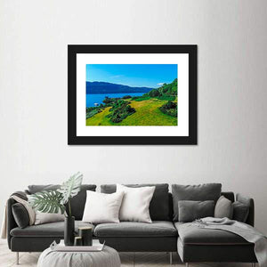 The Blue Water Of Loch Ness presents a panoramic lake scene with a small boat, grassy rolling hills, trees and distant mountains. Rendered photo‑realistically in blues, greens, yellows and white, the print has a serene, peaceful mood that works well in living rooms and modern room decor.
