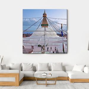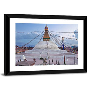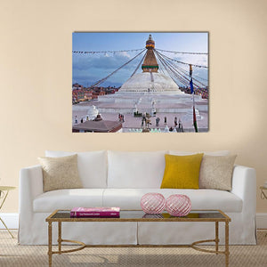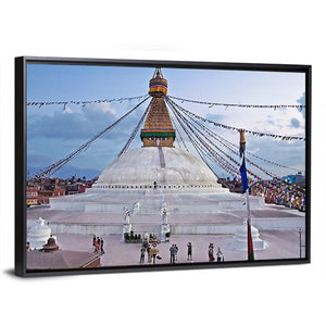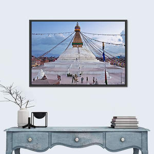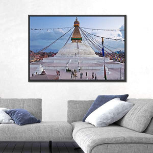 This canvas wall art captures the serene beauty of the Boudhanath Stupa in Nepal. Featuring vibrant prayer flags and people in peaceful motion, it evokes a spiritual atmosphere that is both calming and inviting.