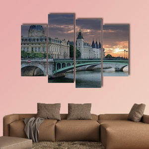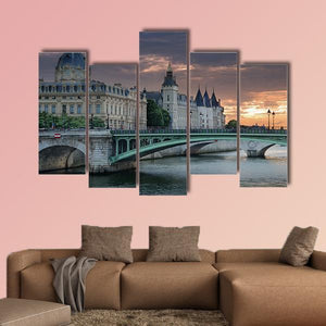 Bridge Pont Notre Dame captures an eye-level cityscape of a green-arched bridge over the river with a domed building under stormy clouds. The realistic scene uses blue, green, grey and a hint of orange to create a historic, serene and dramatic dusk mood. Suits living rooms or studies and pairs with both modern and traditional room decor.