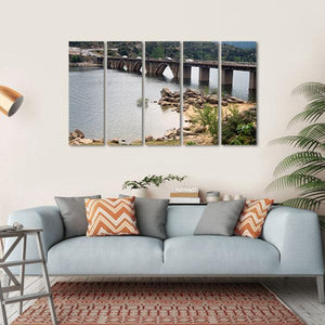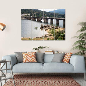 This canvas art captures the serene beauty of a bridge spanning a tranquil river, surrounded by lush mountains and trees. Its realistic style and peaceful mood make it a perfect addition to any landscape art collection.