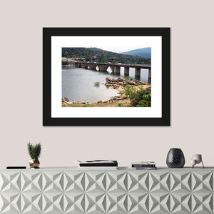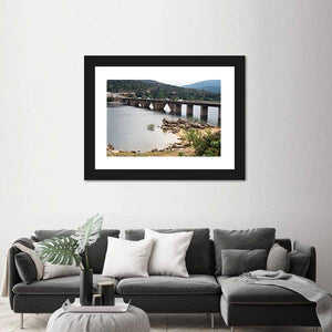 A realistic landscape of the Burguillo Reservoir bridge, showing an arch bridge over calm water with trees, a rocky shoreline and distant mountains. The rule-of-thirds composition and blue-green-gray palette create a calm, scenic mood that suits modern living spaces and room decor.