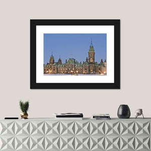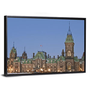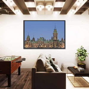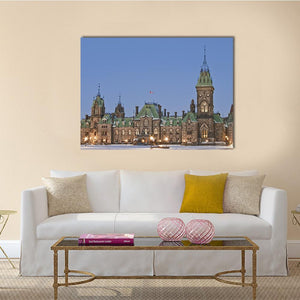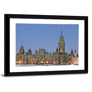 Capture the majestic Parliament buildings of Canada in winter. This artwork features a serene scene with snow blanketing the ground and illuminated architecture, perfect for adding a historic touch to your space.