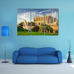 This canvas art beautifully captures the majestic Palma Cathedral, surrounded by lush palm trees and a serene fountain. The bright palette of blues, greens, and earth tones creates a peaceful atmosphere, making it a lovely addition to any room.