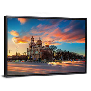 This panoramic canvas captures the Cathedral of the Assumption against a sunset city skyline, with golden domes, stained glass and warm evening hues. Rendered in a photorealistic style with streetlights and traffic trails, it offers vibrant, awe-inspiring color for modern living rooms or entryways.