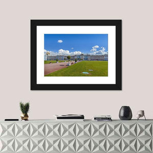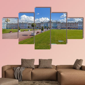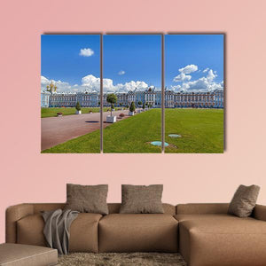 Photorealistic canvas print of the Catherine Palace in Russia, featuring the ornate palace façade, manicured lawn, potted trees and fluffy white clouds. The grand, serene summer scene in blues, greens and gold provides a calm focal piece for a living room or entryway.