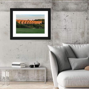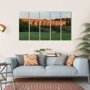 This canvas art features a serene landscape of the Cefn Mawr Viaduct, capturing the beauty of stone arches set against a backdrop of trees and a grassy field. Its warm palette of earth tones and golden hour lighting brings a peaceful atmosphere to any space.