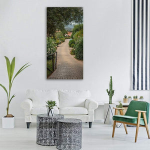 Chia Sardinia Park in Italy depicts a cobblestone pathway framed by lush greenery, trees overhead, and a wooden fence. The realistic landscape carries a peaceful, natural mood in greens, browns, and whites and fits well in modern or nature-inspired room decor.
