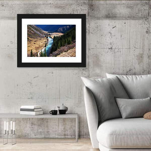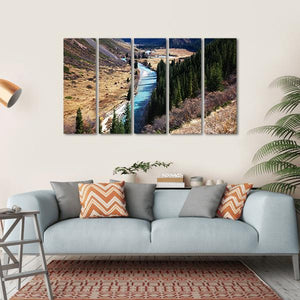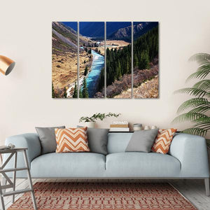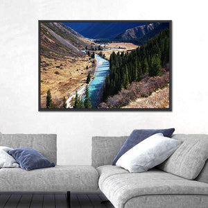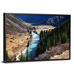 Experience the serene beauty of the Tyan Shan Mountains with this canvas art featuring a winding river, majestic peaks, and lush conifer forests. The realistic depiction captures the natural harmony of blue, green, and brown, creating a calming atmosphere for any space.