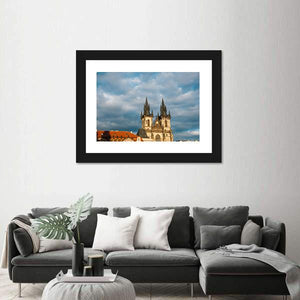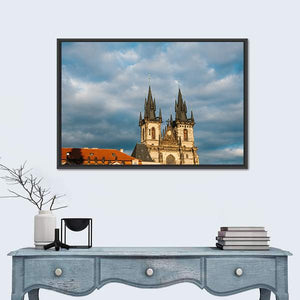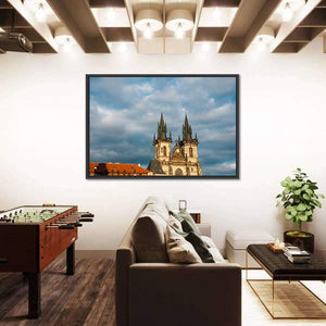 This canvas depicts the Church of the Virgin Mary in the Czech Republic, with gothic towers and steep steeple roofs beneath dark daytime clouds. A symmetrical cityscape in blue, gray, brown and white creates a dramatic, imposing atmosphere. The traditional architectural subject pairs well with classic interiors or modern room decor.