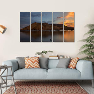 This canvas art piece features a beautiful landscape of rocky outcrops and serene waters set against a stunning sunset in Aguilas, Spain. The calm palette of orange, blue, and gray enhances the majestic and tranquil atmosphere, making it a perfect addition to any nature-themed decor.