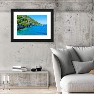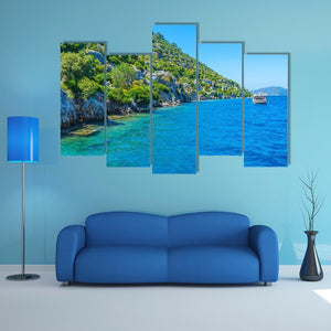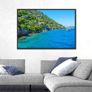 A photorealistic view of Kekova Island’s coast featuring coastal cliffs, clear blue water and a distant white boat. The rule-of-thirds composition and sense of depth create a vibrant, tranquil and serene atmosphere. Suited to modern or nature-focused rooms that welcome calming coastal imagery.
