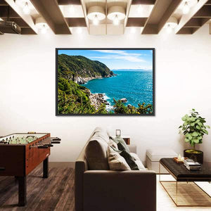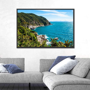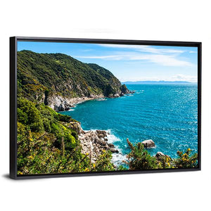 A realistic depiction of the coastline at Abel Tasman National Park, showing rocky shore, foaming waves, cliffs, and lush green hillsides. The blue, green and white palette and clear daytime scene create a serene, peaceful mood that works well in living rooms, entryways, or modern coastal interiors.