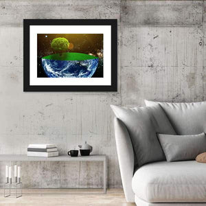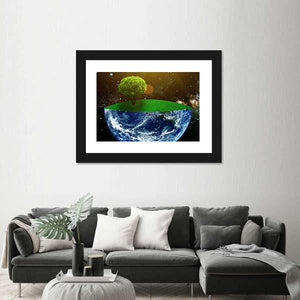 This canvas artwork beautifully captures the essence of our planet with a cross-section view of the earth, showcasing vibrant land and sea along with a lone green tree. Bathed in a starry background, the piece evokes a surreal and hopeful atmosphere, making it a striking addition to any space.