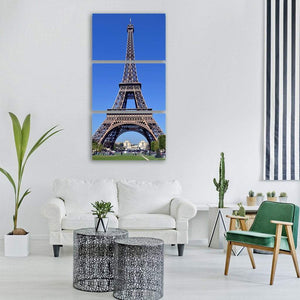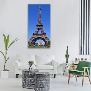 An iconic, photorealistic view of the Eiffel Tower in Paris fills the canvas, captured from a low-angle full shot against a clear blue sky and a sweep of green grass. The image feels grand and travel-oriented and pairs well with modern or travel-themed rooms.
