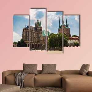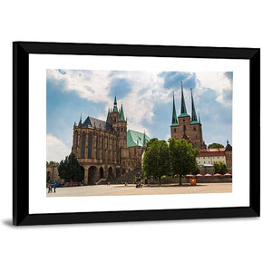 Erfurt Cathedral Canvas Wall Art presents the cathedral’s gothic towers and spires rising above a broad square framed by trees. The realistic, eye-level wide view uses brown, green, blue and gray tones to create a grand, bright atmosphere. It suits modern home interiors and room decor that favor architectural landscape pieces.