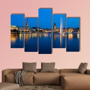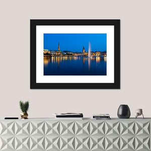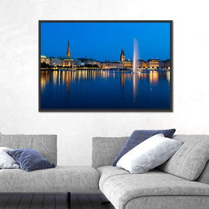 This photographic canvas shows Binnenalster Lake’s nighttime waterfront with a city skyline, dancing fountain jets, and reflections on the water. Illuminated buildings in blue, white, yellow and brown tones create a peaceful, serene atmosphere. A calm choice for modern living rooms or entryways seeking subtle wall decor.