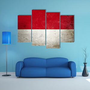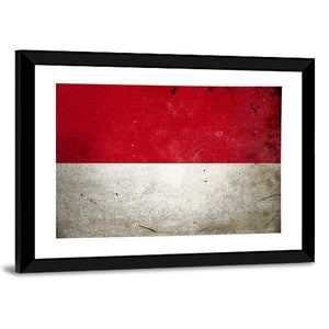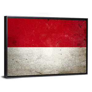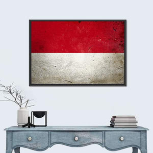 This canvas features the Indonesian flag in a symmetrical, vintage-grunge treatment. A red, white, gray and black palette with a textured surface creates a patriotic, weathered atmosphere. It suits modern home and room decor that leans toward vintage or industrial touches.