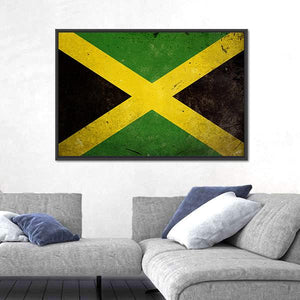 A bold, grungy depiction of the Jamaica flag, its symmetrical layout and worn texture giving a striking vintage feel. Rendered in green, yellow and black, this canvas wall art suits modern or casual home decor and works well as a focal piece in living spaces.