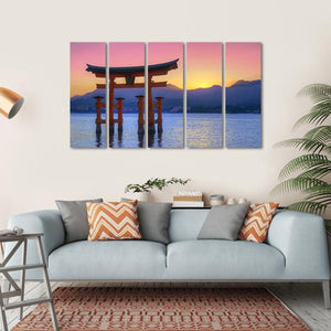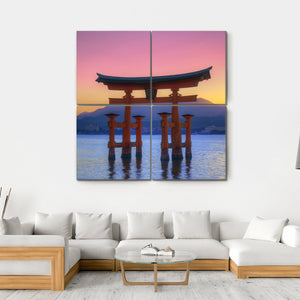 Experience the beauty of Japan with this canvas featuring a Torii gate gracefully submerged in tranquil waters. The vibrant sunset sky, painted in hues of orange, pink, and purple, creates a serene atmosphere that evokes awe. This artwork perfectly complements any modern space.