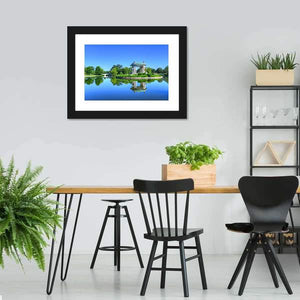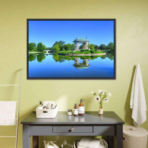 Forest Park, St. Louis — a realistic landscape print of a gazebo beside a lake, surrounded by trees and a bridge. The symmetrical composition and blue, green, and white tones create a serene, peaceful mood, with the gazebo reflected in the water. Pairs nicely with modern or nature-inspired rooms.