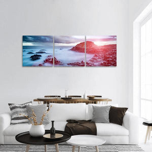 The Giant's Causeway In The Morning shows the rocky coastline and ocean beneath a stormy, ethereal sky. A panoramic composition with long-exposure water and dramatic lighting creates deep, moody atmosphere that suits coastal or modern interiors.