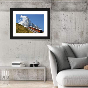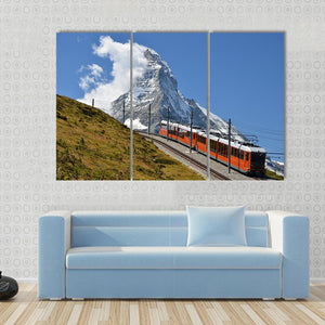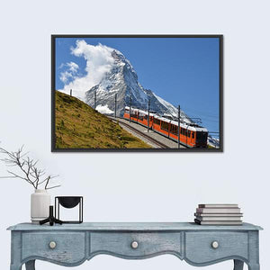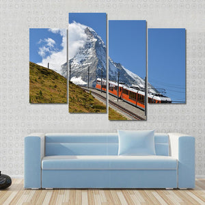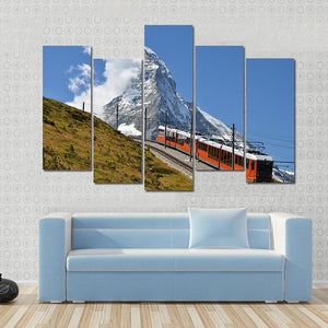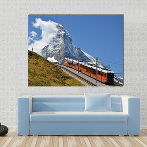 This landscape artwork captures a vibrant scene of an orange train traveling along a railway track, set against majestic snow-capped mountains and fluffy clouds. With its adventurous and scenic atmosphere, it brings a touch of travel inspiration to your space.