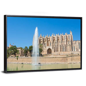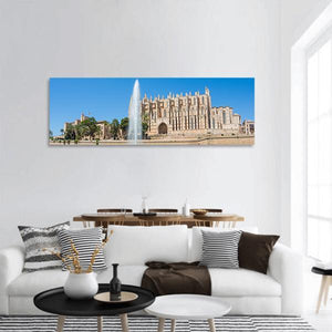 A photorealistic panoramic canvas of Palma de Mallorca showing the cathedral, a tall fountain spraying skyward, trees, and a clear blue sky. The bright, sunny, grand scene—rendered in blue, tan, green, and white—works well in modern living spaces and entryways.