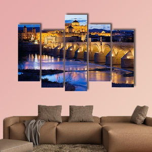 This realistic canvas shows the Roman Bridge, the Mosque-Cathedral of Córdoba and the Guadalquivir River at dusk, with blue, yellow and orange tones. The serene, historic scene—arched bridge illuminated and reflections on the water—creates a calm cityscape focal piece suited to modern room decor.