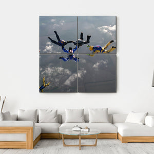This dynamic canvas art features a thrilling scene of skydivers in formation, captured from an aerial perspective. The vibrant palette of blue, yellow, grey, and white brings the excitement of skydiving to your space, making it an ideal piece for adventurous decor.