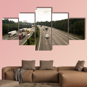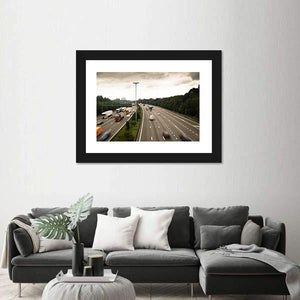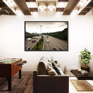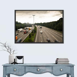 This canvas captures the Antwerp ring road with long exposure motion blur, turning cars and trucks into streaking lines on a busy highway. The gray-and-green, overcast palette and modern action style work well in contemporary interiors and modern living spaces.