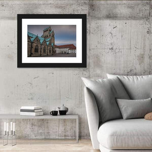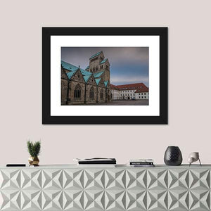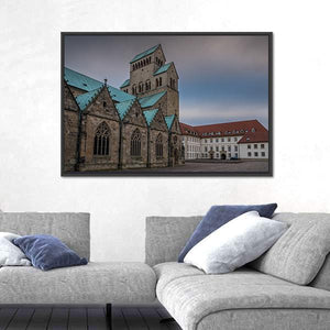 The Hildesheim Cathedral Canvas Wall Art depicts the cathedral’s stone facade, towers, and gothic windows in a wide, eye-level architectural view. The realistic photograph highlights green tiled roofs beneath a cloudy sky and a muted gray, brown, and green palette, creating a historic, overcast mood. This canvas fits room decor needs in living rooms or studies.