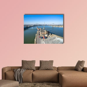 Historic Harbour Of Krefeld presents a wide aerial view of a port waterfront with distant bridges, dock cranes, and buildings along the shore. The realistic, photographic image uses blues, greens, grays and browns to convey an expansive, industrial, bright atmosphere. It suits modern or industrial interiors seeking landscape wall art.