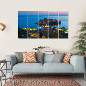 This stunning canvas captures the serene beauty of Sveti Stefan, a picturesque island village in Montenegro. Set against a tranquil dusk sky, the artwork features inviting hues of blue, orange, and pink, showcasing twinkling lights on the buildings and a bridge connecting to the island.