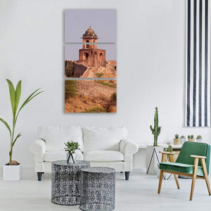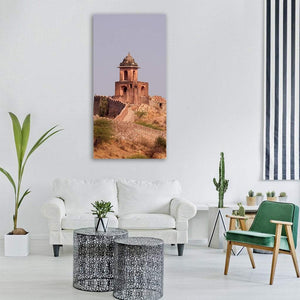 This canvas portrays Jaigarh Fort near Jaipur, India — an ancient stone fortification with a domed tower set on a dry hillside. Rendered in warm browns, tans and muted greens with hints of purple, the composition follows the rule of thirds to convey a historic, arid and grand mood. Its rustic character pairs well with earth-toned interiors.