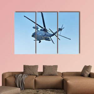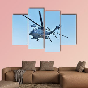 A realistic, close-up depiction of a twin-engine UH-60j helicopter in flight against a clear blue sky. The dynamic angle and blue‑gray palette give the image a powerful, aerial, active mood and suit modern rooms or aviation and military-themed decor.