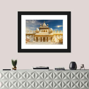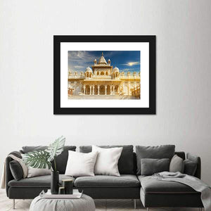 A centered, symmetrical study of a white marble building with arches, domes and columns, shown in a palette of white, blue and gold. The scene feels grand, serene and historic, with sunlight glinting on intricate carvings. Suited to classical or modern interiors as wall decor.