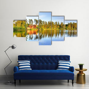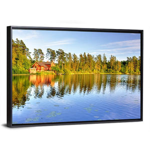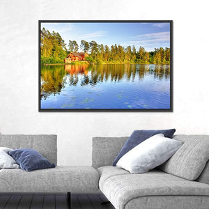 Red Cabin by the Lake Canvas Wall Art
