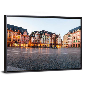 Old Town of Mainz Canvas Wall Art shows a calm, historic cityscape with buildings, a town square, and cobblestone pavement. Rendered realistically in a wide-angle, slightly low perspective, the print uses warm oranges and browns with cool greys and blues and highlights illuminated windows and dark rooflines. It suits modern or traditional living spaces, studies, or hallways as subtle wall decor.
