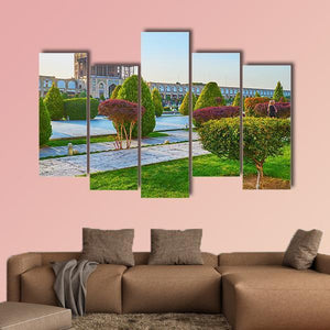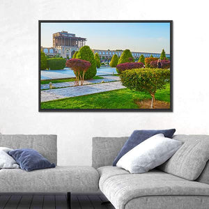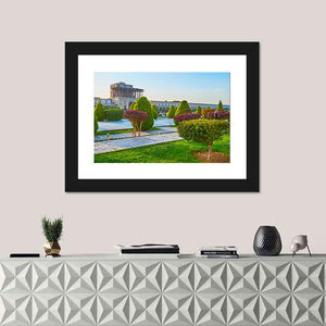Calm and majestic, this photorealistic canvas depicts the Medieval Qapu Palace with an ornately decorated facade, manicured bushes, trees, and a paved walkway in daylight. The green, brown, blue, and beige palette brings a serene landscape feel that works well in living rooms or entryways and complements both classic and modern decor.