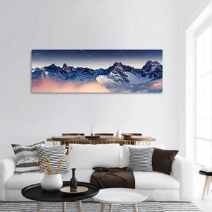 A panoramic night view of snowy mountains beneath the Milky Way, with streaks of stars and pinkish clouds at the mountain base. Calm, majestic tones of blue, white, and dark blue give an ethereal, serene feeling that suits modern living rooms or bedrooms.