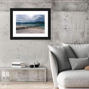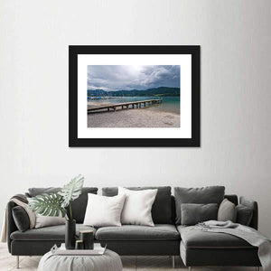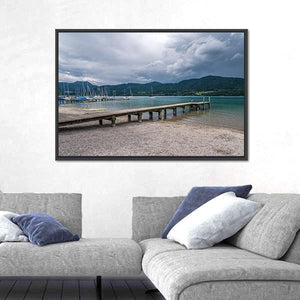 This canvas shows a lakeside scene with a wooden dock, pebbly shore, boats and distant mountains. An overcast sky and a palette of blues, greens, grays and browns give the image a calm, serene feeling with a hint of drama. Suits modern or nature‑inspired rooms and simple decor schemes.