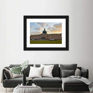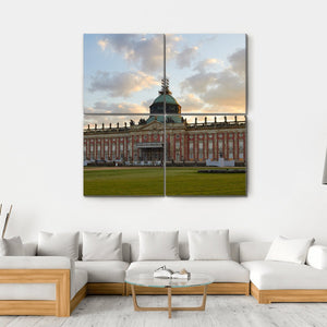 This canvas art features a majestic view of the Neues Palais in Germany, showcasing its grandeur with striking columns, a dome, and serene clouds. The harmonious palette of red, green, blue, and gold captures the beauty of the palace and its lush lawn.