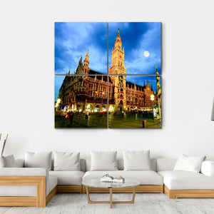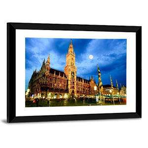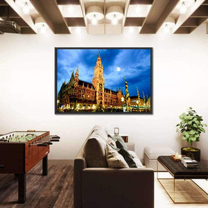 This canvas art features the stunning Marienplatz in Munich, showcasing its historic gothic architecture under a luminous full moon. The dramatic palette of blues and golds captures the beauty of the town square, making it a striking addition to any wall décor.
