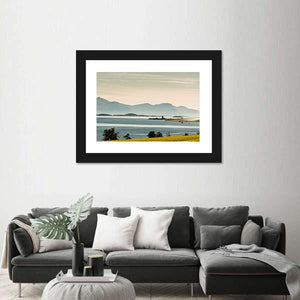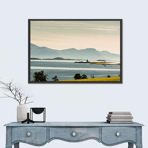 This peaceful canvas art captures a serene summer landscape in Norway, featuring layered mountains, a bright yellow field, and a sparkling water body. Its realistic style invites tranquility, making it an excellent addition to your wall decor.