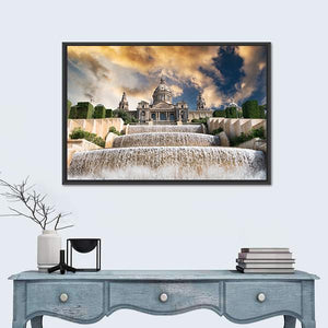 The Palau Nacional Situated Canvas Wall Art depicts a realistic landscape with cascading, multi-tiered waterfalls, domed architecture, and manicured gardens. A low-angle, layered composition and a palette of brown, green, blue, white and gold create a majestic, grand and serene mood while suggesting dynamic motion in the water. This canvas suits modern wall decor and provides a calm, architectural focal point.