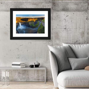 Palouse Falls, Washington appears in this panoramic canvas with a waterfall cascading into a deep pool and a winding river through a verdant canyon lit by golden-hour sunlight. The blue, green, brown and gold palette gives a majestic, serene atmosphere that fits living rooms and nature-inspired spaces.