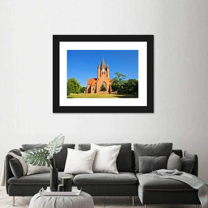 The Paulus Church Germany Canvas Art shows a centered, realistic view of a brick church with a tall spire, arched windows and a clock face, framed by trees and a green lawn. Daytime summer light and a palette of red, green, blue, brown and white create a serene, picturesque mood that suits home decor and faith spaces.