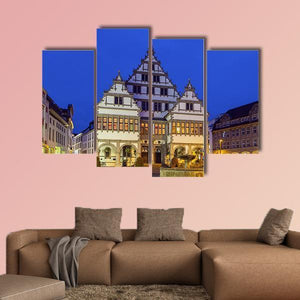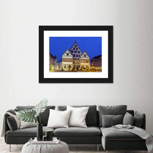 The Renaissance Town Hall shows a peaceful cityscape of historic buildings around a town square and fountain, centered on a symmetrical façade with stepped gables and ornate windows. Soft white, beige, blue, and warm yellow tones plus illuminated building details give it a classic, elegant mood that suits traditional interiors and classic room decor.