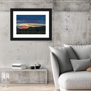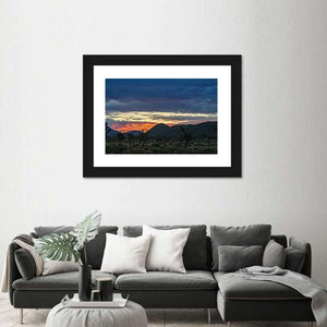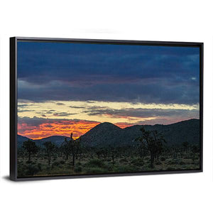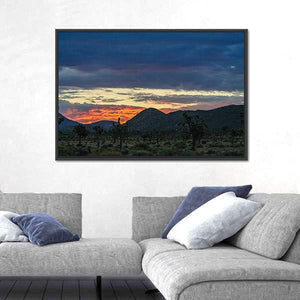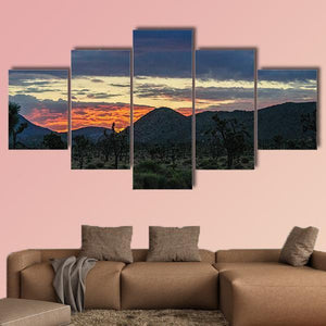 Rising Sun In California features a desert landscape with mountains and silhouetted Joshua trees beneath dark clouds, rendered in realistic dark blue, orange, green, and brown tones. The scene reads dramatic, serene, and vast, making it a calm focal point for modern living rooms or nature-themed spaces.