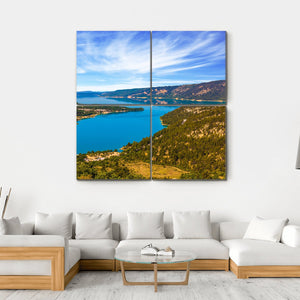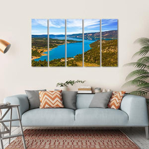 This canvas art captures the serene beauty of the River Verdon in France, featuring a breathtaking aerial view of the lake, mountains, and lush trees. The bright palette of blues, greens, and wispy clouds evokes a vast and tranquil atmosphere.
